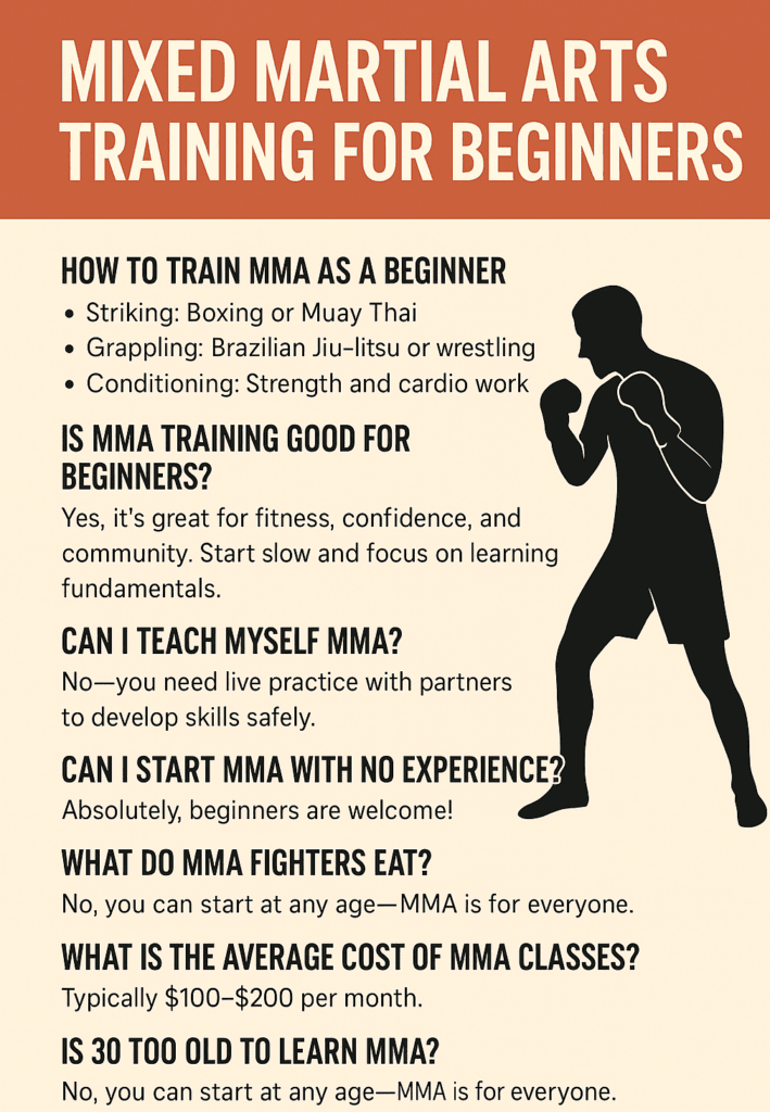 Mixed Martial Arts (MMA) training combines techniques from multiple disciplines such as boxing, wrestling, Brazilian jiu-jitsu, and Muay Thai to build strength, endurance, and skill. According to the UFC Performance Institute, beginner MMA training focuses on foundational movement, conditioning, and proper technique rather than full contact, helping newcomers build confidence and fitness safely.